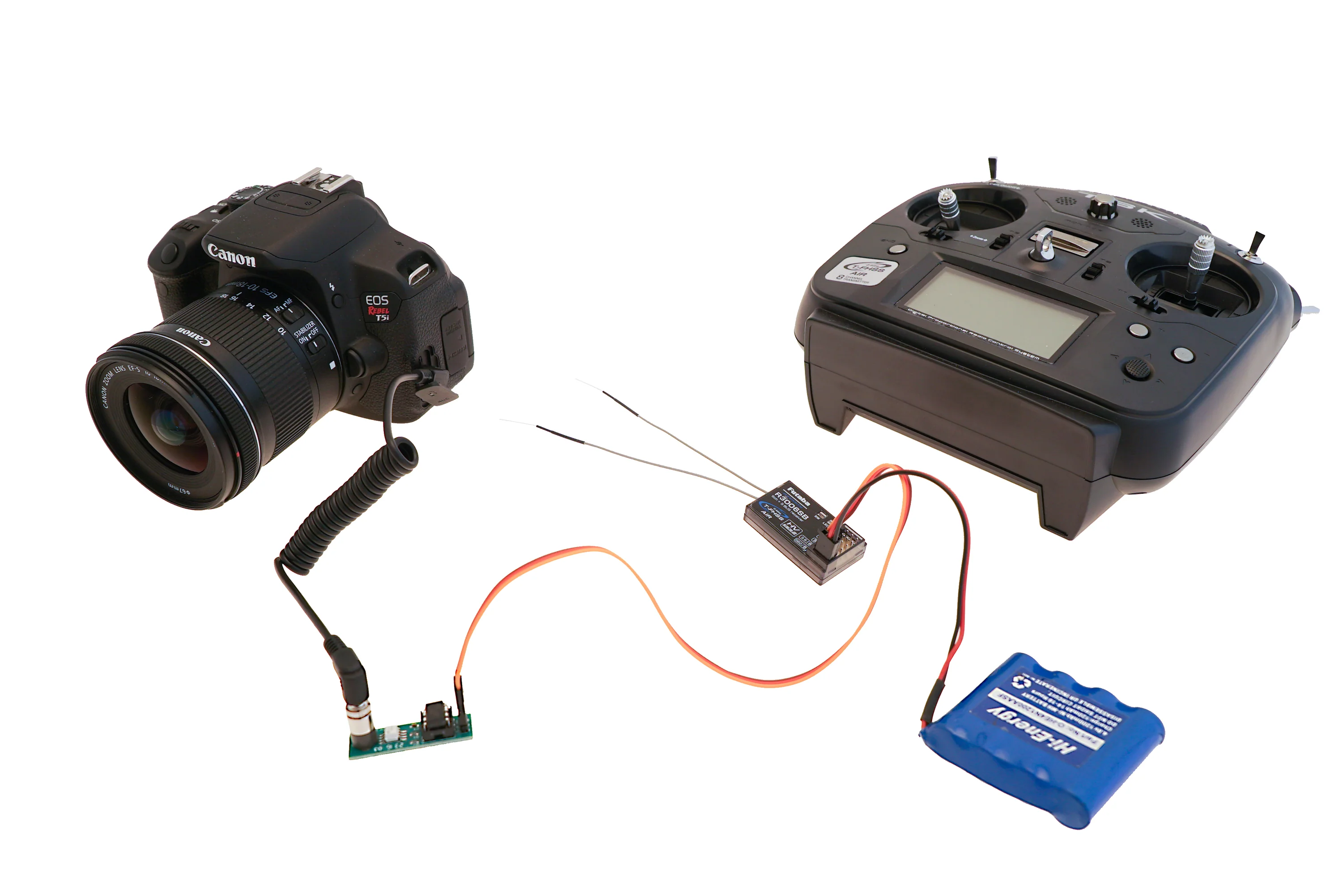 The RC Trigger plugs into a standard hobby radio control receiver and responds to PWM signals just like a normal servo. Depending on the selected channel, you can activate the trigger via your radio controller's sticks or with an auxiliary switch or slider. When a switch or stick is low, the RC Trigger sends no command to the camera, in the middle it sends a half-press command and when it is high it sends a full-press command.